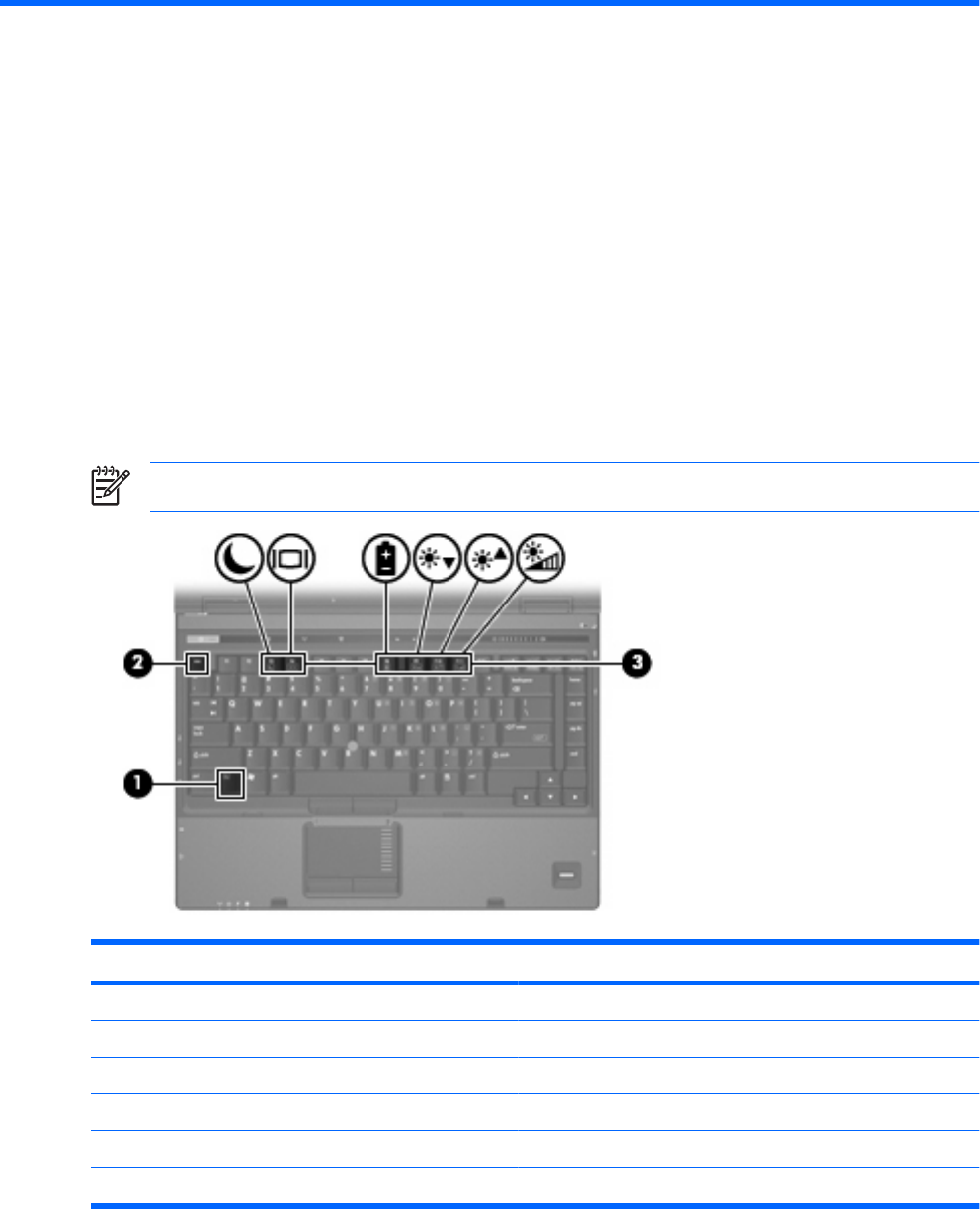 As teclas de acesso rápido são combinações da tecla fn (1) e da tecla esc (2) ou uma das teclas de