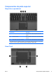 Componentes da parte frontal Componente Descrição (1) Acesa: Está ligado um dispositivo integrado sem fios, tal como um dispositivo de rede local sem fios (WLAN), o HP Broadband Wireless Module (Módulo de banda larga sem fios HP) e/ou um dispositivo Bluetooth. Luz sem fios Desligada: Todos os dispositivos sem fios estão desligados. (2) (3) (4) Luz de alimentação Luz da bateria Luz da unidade ● Acesa: o computador está ligado. ● Intermitente: O computador está no modo de Suspensão.