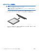 メディア カードの停止と取り出し 注意: データの消失やシステムの応答停止を防ぐため、メディア カードを取り出す前にメ ディア カードを停止してください。 1. 情報を保存し、メディア カードに関連するすべてのプログラムを閉じます。 注記: データ転送を停止するには、オペレーティング システムの[コピーしています] ウィンドウで[キャンセル]をクリックします。 2. メディア カードを停止します。 a. タスクバーの右端にある通知領域の[ハードウェアの安全な取り外し]アイコンをダブルク リックします。 注記: [ハードウェアの安全な取り外し]アイコンを表示するには、通知領域の[隠れ ているインジケータを表示します]アイコン(<または<<)をクリックします。 3. JAWW b. 一覧のメディア カード名をクリックします。 c.