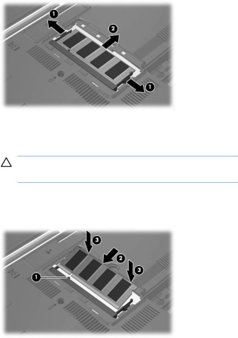 カチッと音がして留め具がメモリ モジュールを固定するまで、メモリ モジュールの左右の