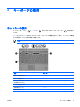 5 ポインティング デバイスの使用 次の図および表では、コンピュータのポインティング デバイスについて説明します。 名称 説明 (1) 左のポインティング スティック ボタ ン 外付けマウスの左ボタンと同様に機能します (2) ポインティング スティック ポインタを移動して、画面上の項目を選択した り、アクティブにしたりします (3) 右のポインティング スティック ボタ ン 外付けマウスの右ボタンと同様に機能します *この表では初期設定の状態について説明しています。 タッチパッドの設定を表示したり変更した りするには、[スタート]→[コントロール パネル]→[プリンタとその他のハードウェア]→[マウス]の 順に選択します JAWW 11