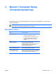 Indholdsfortegnelse 1 Adgang til Computer Setup (Computeropsætning) 2 Computer Setup (computeropsætning), fabriksindstillinger 3 Menuer i Computer Setup (Computeropsætning) File (Filer), menu .................................................................................................................................. 5 Sikkerhed, menu .................................................................................................................................. 6 Diagnostics (Diagnosticering), menu .