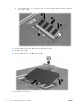 15. 외부 전원과 외부 장치를 다시 연결합니다. 16. 컴퓨터의 전원을 켭니다. 주 메모리 모듈 슬롯의 메모리 모듈 업그레이드 주 메모리 모듈 슬롯의 메모리 모듈을 업그레이드하려면 다음과 같이 하십시오. KOWW 1. 작업 내용을 저장합니다. 2. 컴퓨터를 종료합니다. 컴퓨터가 꺼져 있는지 아니면 최대 절전 모드 상태인지 확실하지 않은 경 우에는 전원 버튼을 눌러 컴퓨터를 켠 다음 운영체제의 절차에 따라 정상적으로 컴퓨터를 종료합 니다. 3. 컴퓨터에 연결된 모든 외부 장치를 분리합니다. 4. AC 콘센트에서 전원 코드를 뽑습니다. 5. 평평한 장소에 컴퓨터를 뒤집어 놓습니다. 6. 컴퓨터에서 배터리를 분리합니다. 7. 키보드 나사 3 개를 분리합니다. 8. 컴퓨터를 뒤집어 엽니다.