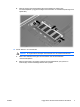 b. Fatta tag i kanten på minnesmodulen (2) och dra försiktigt ut modulen från minnesmodulplatsen. (Lägg den borttagna minnesmodulen i en antistatisk förpackning för att skydda den.) 10. Så här sätter du i en minnesmodul: VIKTIGT SVWW Se noga till att du inte böjer minnesmodulen för att undvika att skada den. a. Rikta in den skårade kanten (1) av minnesmodulen mot den skårade fliken i minnesmodulplatsen. b.