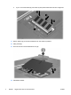 9. Lossa tangentbordet genom att föra de fyra frigöringsspärrarna i pilarnas riktning. 10. Lyft försiktigt tangentbordets överkant uppåt och luta tangentbordet uppåt hela vägen, tills tangentbordets nedre kant ligger an mot datorns handstöd. 11. Ta bort minnesmodulen från minnesmodulfacket: a. SVWW Dra bort platshållarna (1) på vardera sida om minnesmodulen. (Minnesmodulen lutas uppåt.