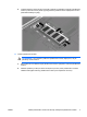 10. Posuňte 4 uvolňovací západky klávesnice a uvolněte klávesnici. 11. Opatrně nadzvedněte horní hranu klávesnice a naklánějte ji, dokud se nepoloží na podpěru počítače. 12. Vytáhněte paměťový modul do zásuvky paměťového modulu: a. CSWW Odtáhněte pojistné svorky (1) na obou stranách paměťového modulu. (Paměťový modul se nakloní nahoru.