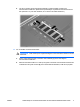b. Tag fat om kanten på hukommelsesmodulet (2), og træk forsigtigt modulet ud af hukommelsesmodulslotten. (Med henblik på at beskytte et fjernet hukommelsesmodul bør det opbevares i en pose eller beholder, der er sikret mod statisk elektricitet.) 13. For at indsætte et hukommelsesmodul: FORSIGTIG! Med henblik på at undgå beskadigelse af hukommelsesmodulet må du ikke bukke det. DAWW a. Placer hukommelsesmodulet, så kanten med indhakket (1) passer med tappen i hukommelsesmodulslotten. b.