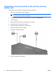 b. Grasp the edge of the memory module (2), and gently pull the module out of the memory module slot. (To protect a memory module after removal, place it in an electrostatic-safe container.) 11. To insert a memory module: CAUTION To prevent damage to the memory module, be sure that you do not bend the memory module. ENWW a. Align the notched edge (1) of the memory module with the tab in the memory module slot. b.