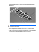 b. Fassen Sie das Speichermodul am Rand (2), und ziehen Sie es vorsichtig aus dem Speichersteckplatz. (Bewahren Sie Speichermodule in einem elektrostatikgeschützten Behältnis auf.) 11. So setzen Sie ein Speichermodul ein: VORSICHT Um Schäden am Speichermodul zu vermeiden, achten Sie darauf, das Speichermodul nicht zu biegen. DEWW a. Richten Sie die eingekerbte Kante (1) des Speichermoduls an der Führungsnase im Speichersteckplatz aus. b.