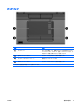 名称 説明 消灯:コンピュータが外部電源に接続されている場合は、コンピ ュータのすべてのバッテリが完全に充電されるとバッテリ ランプ が消灯します。コンピュータが外部電源に接続されていない場合 は、ローバッテリ状態になるまでランプが消灯したままになりま す (7) ドライブ ランプ ● 点滅:ハードドライブまたはオプティカル ドライブにアク セスしています ● オレンジ色に点灯: HP モバイル データ プロテクション 3D によって内蔵ハードドライブが一時停止しています *電源ランプは 2 つあり、両方とも同じ情報を通知します。電源ボタンのところにある電源ランプはコンピュータを開いてい るときにのみ見えます。もう一方の電源ランプは、コンピュータ前面の常に見える場所にあります。 †無線ランプは 2 つあり、両方とも同じ情報を通知します。無線ボタンのところにある無線ランプはコンピュータを開いて いるときにのみ見えます。もう一方の無線ランプは、コンピュータ前面の常に見える場所にあります。 JAWW 表面の各部 5