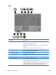 Componente Descrizione Spenta: se il computer è collegato ad una fonte di alimentazione esterna, la spia si spegne quando tutte le batterie nel computer sono completamente cariche. Se il computer non è collegato ad una fonte di alimentazione esterna, la spia resta spenta finché non si raggiunge una condizione di basso livello di carica della batteria. (7) Spia dell'unità ● Lampeggiante: è in corso l’accesso all'unità disco rigido o all'unità ottica.