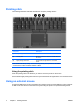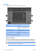 TouchPad The following illustration and table describe the computer TouchPad. Component Description (1) TouchPad* Moves the pointer and selects or activates items on the screen. Can be set to perform other mouse functions, such as scrolling, selecting, and doubleclicking. (2) Left TouchPad* button Functions like the left button on an external mouse. (3) TouchPad scroll zone* Scrolls up or down. (4) Right TouchPad button* Functions like the right button on an external mouse.