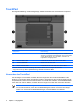 TouchPad Die folgende Abbildung und die dazugehörige Tabelle beschreiben das TouchPad des Computers. Komponente Beschreibung (1) TouchPad* Dient zum Bewegen des Mauszeigers und zum Auswählen und Aktivieren von Objekten auf dem Bildschirm. Kann zum Ausführen anderer Mausfunktionen, wie z. B. Blättern, Auswählen und Doppelklicken, festgelegt werden. (2) Linke TouchPad*-Taste Funktioniert wie die linke Taste einer externen Maus. (3) TouchPad-Bildlauffeld* Bildlauf nach oben oder unten.