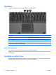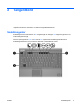 styrplatta I nedanstående bild och tabell visas och beskrivs datorns styrplatta. Komponent Beskrivning (1) Styrplatta* Flyttar pekaren och väljer eller aktiverar objekt på skärmen. Kan konfigureras för användning av andra musfunktioner, t ex rullning, markering och dubbelklickande. (2) Vänster knapp på styrplattan* Fungerar som vänsterknappen på en extern mus. (3) Styrplattans rullningsområde För rullning uppåt och nedåt.