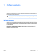 1 Software-updates Updates van de software die bij de computer is geleverd zijn beschikbaar via het hulpprogramma HP Software Update of op de website van HP. VOORZICHTIG Als de computer op een bedrijfsnetwerk is aangesloten, raadpleegt u uw netwerkbeheerder voordat u software-updates installeert, vooral als het gaat om updates van het systeem-BIOS. Software updaten HP Software Update is een hulpprogramma waarmee automatisch wordt gecontroleerd op softwareupdates van HP.