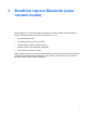 3 Brezžične naprave Bluetooth (samo nekateri modeli) Naprava Bluetooth je namenjena brezžični komunikaciji na kratkih razdaljah, ki lahko nadomesti običajne kabelske povezave med elektronskimi napravami, kot so: ● Omrežne dostopne točke. ● Računalniki (namizni, prenosni, dlančniki). ● Telefoni (mobilni, brezžični, pametni telefoni). ● Naprave za delo s slikami (tiskalnik, fotoaparat). ● Zvočne naprave (slušalke, zvočniki).