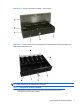 Abbildung 1-5 HP Flip-Top Kassenschublade – Komponenten Abbildung 1-6 Komponenten der normal belastbaren druckerbetriebenen Kassenschublade und USB-Kassenschublade von HP HINWEIS: Das Design der Einsätze der Kassenschublade variiert je nach Land. (Gilt nur für hoch und normal belastbare sowie USB-Kassenschubladen) Tabelle 1-1 Komponenten der Kassenschublade 1 Medienschlitz zum Einrasten und Lösen für verschiedene organisatorische Optionen (nur bei hochbelastbarer Kassenschublade einstellbar).