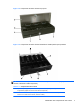 Tableau 1-1 Composants du tiroir-caisse (suite) 4 3 Verrou fonctionnel offrant plusieurs niveaux de sécurité : verrouillé fermé, verrouillé ouvert, ouverture manuelle ou en ligne suivant le modèle. Reportez-vous à Connexion et verrouillage du tiroir-caisse à la page 5. 4 Coulisses à roulement à billes de grande qualité pour prolonger la durée de vie (tiroir-caisse robuste uniquement). 5 Mécanisme de verrouillage garantissant un fonctionnement constant.