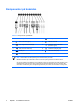 Komponenter på baksidan Tabell 1-3 Komponenter på baksidan 1 Anslutning för nätsladd 7 Parallellport 2 PS/2-muskontakt (grön) 8 Bildskärmskontakt 3 PS/2-Tangentbordskontakt (lila) 9 Kontakt för ljud ut; strömsatta ljudenheter (grön) 4 USB (Universal Serial Bus) 10 Kontakt för ljudingång (blå) 5 Seriell port 11 Mikrofonkontakt (rosa) 6 RJ-45 Nätverkskontakt OBS! Antal kontakter och dess placering kan variera beroende på modell.