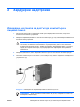 Изваждане на 3,5-инчов четец за медийни карти или флопидисково устройство В гнездото за 3,5-инчово външно устройство може да се постави флопидисково устройство или четец за медийни карти. Процедурата за изваждане е една и съща и за двете устройства. 1. Изключете компютъра по нормалния начин чрез операционната система, след което изключете и външните устройства. 2. Извадете захранващия кабел от контакта и компютъра, след това извадете кабелите на всички външни устройства. 3.