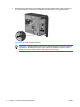 2 Techninės įrangos atnaujinimas Kompiuterio šoninio dangčio ir priekinio skydo nuėmimas 1. Naudodami operacinę sistemą, tinkamai išjunkite kompiuterį, tada išjunkite visus kitus išorinius prietaisus. 2. Ištraukite maitinimo kabelį iš elektros tinklo lizdo ir kompiuterio (1) ir atjunkite visus kitus išorinius prietaisus. ĮSPĖJIMAS: Neatsižvelgiant į tai, ar kompiuteris įjungtas, ar išjungtas, kai maitinimo laidas įjungtas į veikiantį elektros lizdą, sistemos plokštėje yra įtampa.