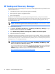 HP Backup and Recovery Manager The HP Backup and Recovery Manager is an easy-to-use, versatile application that is pre-loaded on each system and allows you to: ● create Recovery Points to back up the entire system incrementally ● back up the entire system in a single hard archive ● back up individual files Backups can be scheduled to occur automatically at designated intervals, or they can be initiated manually.