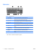 Dijelovi na stražnjoj strani Tablica 1-2 Dijelovi na stražnjoj strani 1 Priključnica naponskog kabela 7 RJ-45 mrežna priključnica 2 Sklopka za odabir napona 8 Paralelna priključnica 3 PS/2 priključnica za miša (zelena) 9 Priključnica za monitor 4 Priključnica za PS/2 tipkovnicu (ljubičasta) 10 Izlazna priključnica za zvučne uređaje s napajanjem (zelena) 5 Univerzalna serijska sabirnica (USB) 11 Priključnica za ulaz zvuka (plava) 6 Serijska priključnica 12 Priključnica za digitalno su