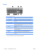 Identification des éléments situés à l'arrière Tableau 1-2 Identification des éléments situés à l'arrière 1 Connecteur du cordon d'alimentation 7 Connecteur réseau RJ-45 2 Sélecteur de tension 8 Connecteur parallèle 3 Connecteur pour souris PS/2 (vert) 9 Connecteur de l'écran 4 Connecteur pour clavier PS/2 (violet) 10 Connecteur audio de sortie de ligne pour périphériques audio alimentés (vert) 5 USB 11 Connecteur audio d'entrée de ligne (bleu) 6 Connecteur série 12 Connecteur de mon