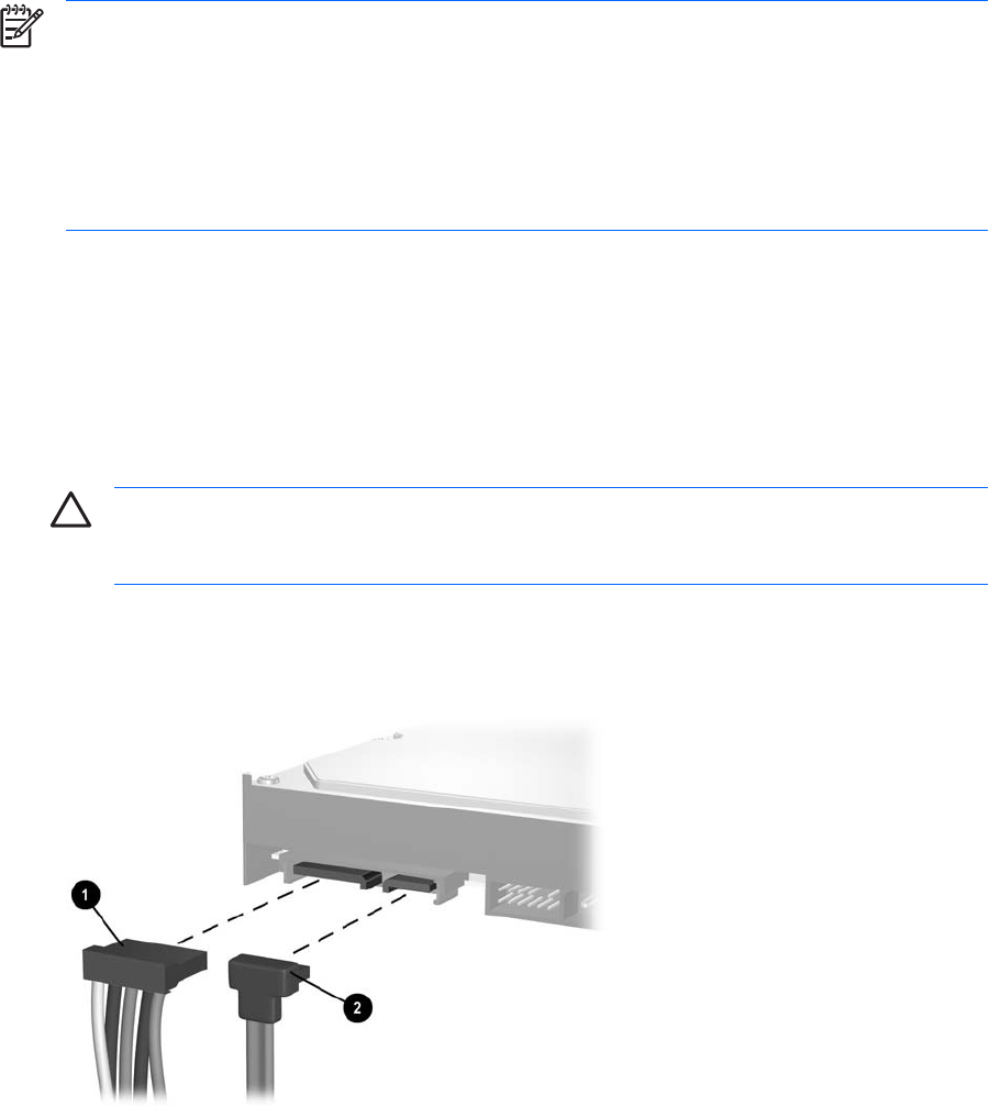 6. Scollegare il cavo di alimentazione (1) e il cavo dati (2) dal retro dell'unità disco rigido.