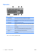 Deli na zadnji strani Tabela 1-2 Deli na zadnji strani 1 Priključek za napajalni kabel 7 Omrežni priključek RJ-45 2 Stikalo za izbiro napetosti 8 Vzporedni priključek 3 Priključek PS/2 za miško (zelen) 9 Priključek za monitor 4 Priključek PS/2 za tipkovnico (vijoličast) 10 Izhodni priključek za naprave za zvok z lastnim napajanjem (zelen) 5 Univerzalno serijsko vodilo (USB) 11 Vhodni priključek za zvok (moder) 6 Zaporedni priključek 12 Priključek za monitor DVI-D (Digital Video Inter