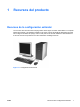 1 Recursos del producto Recursos de la configuración estándar Los recursos de la microtorre HP Compaq pueden variar según el modelo. Para obtener un completo listado del hardware y del software instalado en el equipo, ejecute la utilidad de diagnóstico (incluido sólo en algunos modelos de equipo). Instruccones para el uso de esta utilidad son suministrados en la Guía de solución de problemas en el Documentation and Diagnostics CD.