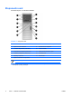 Näppäimistö Taulukko 1-4 Näppäimistön osat 1 FIWW 1 Toimintonäppäimet Toimintonäppäimien avulla voidaan suorittaa erityistoimintoja käytetystä sovelluksesta riippuen. 2 Muokkausnäppäimet Muokkausnäppäimiä ovat seuraavat: Insert, Home, Page Up, Delete, End ja Page Down. 3 Tilan merkkivalot Tilan merkkivalot ilmaisevat tietokoneen tilan ja näppäimistöasetukset (Num Lock, Caps Lock ja Scroll Lock). 4 Numeronäppäimet Numeronäppäimet toimivat laskimen näppäimistön tapaan.