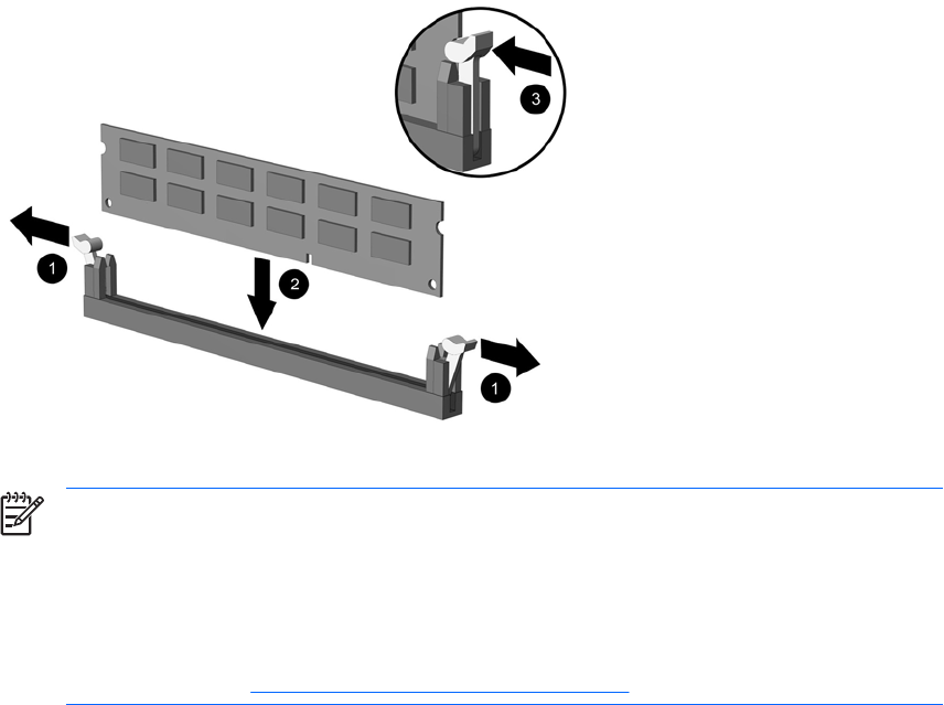 7. Odprite oba zaklepa podnožja za pomnilniški modul (1) in vstavite modul v podnožje (2).