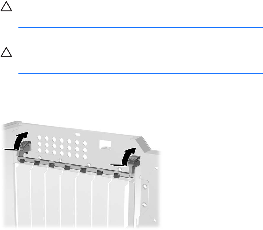 7. Push down and out on the two green thumb tabs inside the chassis and rotate the expansion card