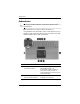 Komponenter Komponenter på høyre side Komponent Beskrivelse 1 Lydutgang (hodetelefoner) Gjengir lyd når det er koblet til stereohøyttalere med egen strømforsyning, hodetelefoner, øreplugger, hodesett eller fjernsynslyd. 2 Lydinngang, mikrofonkontakt Kobler til hodesett eller en mikrofon. 3 USB-kontakter (2) Kobler USB 1.1- og 2.0-kompatible enheter til maskinen med en standard USB-kabel. Du kan også bruke kontaktene for å koble en eventuell ekstern MultiBay II til maskinen.