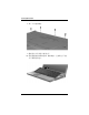 添加或更换内存模块 在扩展内存模块插槽中添加内存模块 要在扩展内存模块插槽中添加或更换内存模块,请执行以下 操作: 1. 保存您的工作并关闭所有打开的程序。 ✎ 确认笔记本计算机未处于休眠模式。如果您无法 确定笔记本计算机是已经关闭还是处于休眠模式, 请先按电源按钮打开计算机。然后通过操作系统 关闭笔记本计算机。 2. 单击 Start (开始), Lock (锁定)按钮旁边的箭头, 然后单击 Shut Down (关机)。 3. 合上显示屏。 4. 断开所有与笔记本计算机相连的外接设备。 5. 拔出电源线插头。 6. 翻转笔记本计算机,将其放在平整的表面上。 7.