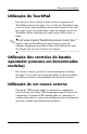 Dispositivos apontadores Configuração de preferências do TouchPad A janela Propriedades de Mouse no Windows permite personalizar as configurações do dispositivo apontador, incluindo: ■ Toque do TouchPad, que permite a você tocar no TouchPad uma vez para selecionar um item ou duas vezes para dar um clique duplo em um item (ativado por padrão). ■ Movimento da borda, que permite continuar a rolagem mesmo que seus dedos atinjam a borda do TouchPad (desativado por padrão).