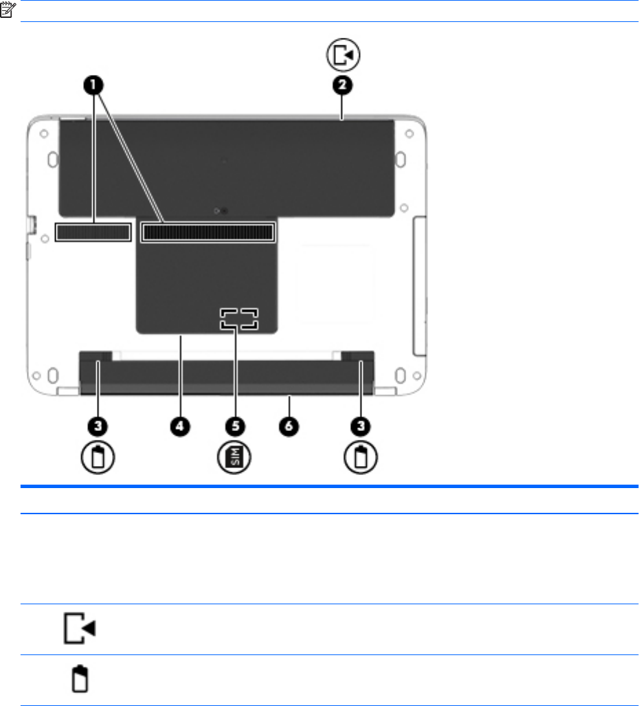(4)   Service door Provides access to the wireless LAN (WLAN) module slot,