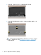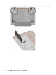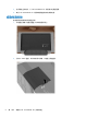 3. 在系统完全关机后,从 HP TouchSmart PC 背面拔下电源适配器。 4. 断开 HP TouchSmart PC 背面和侧面连接的所有其他电缆。 拆除电脑支架 完成前面的步骤后可拆除电脑支架。 2 1. 将电脑正面朝下放置在覆盖了软布的稳固平面上。 2.