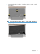 装回电脑支架 执行以下步骤可将电脑支架装回到 HP TouchSmart PC 上。 1. 拧松底部将后盖固定在电脑上的 2 颗螺丝。 不停转动螺丝刀,直到听见 5 次滴答声。 这表示螺 丝已经足够松动了。 如果后盖的中央位置有第 3 颗螺丝 (1),请同样将其拧松。 2.