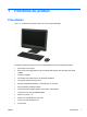 1 Fonctions du produit Présentation Figure 1-1 Ordinateur professionnel All-in-One HP Compaq 8200 Elite L'ordinateur professionnel All-In-One HP Compaq 8200 Elite offre les propriétés suivantes : FRWW ● Format All-in-One intégré ● Écran large d'une diagonale de 23 pouces WLED HD intégrale avec affichage anti-reflets (1080p) ● Inclinaison réglable ● Processeurs Intel Intel® Core™ de deuxième génération ● Technologie Chipset Intel avec vPro ● Système d'exploitation Windows 7 Professionnel 32 o