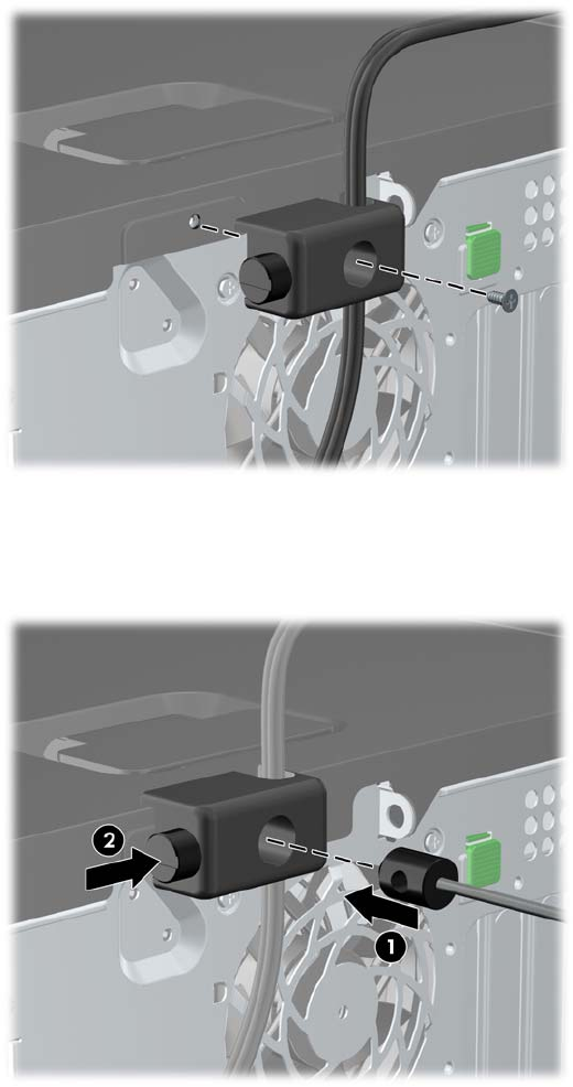 7. Saugos kabelio sujungimo galą įdėkite į užraktą (1) ir paspauskite mygtuką (2), kad užraktas