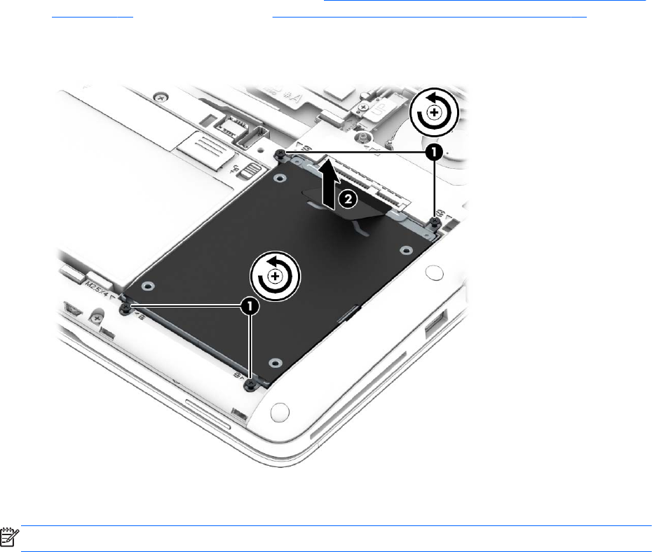 5. Afrouxe os 4 parafusos da tampa da unidade de disco rígido (1). Puxe a guia de pano da