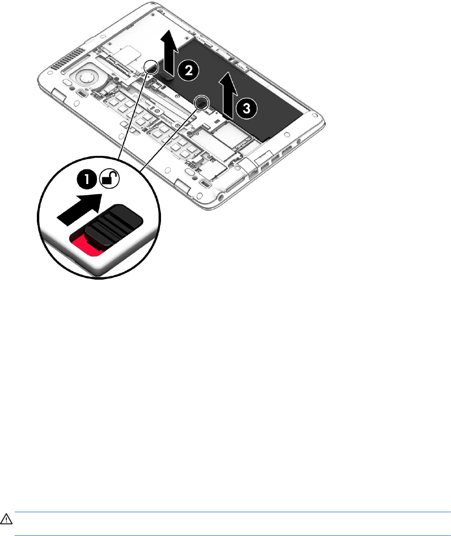 2. Плъзнете двата ключа за освобождаване на батерията към положение на отключване (1).