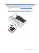 5. Открутите 4 винта (1) на крышке отсека для жесткого диска. Потяните вверх тканевой