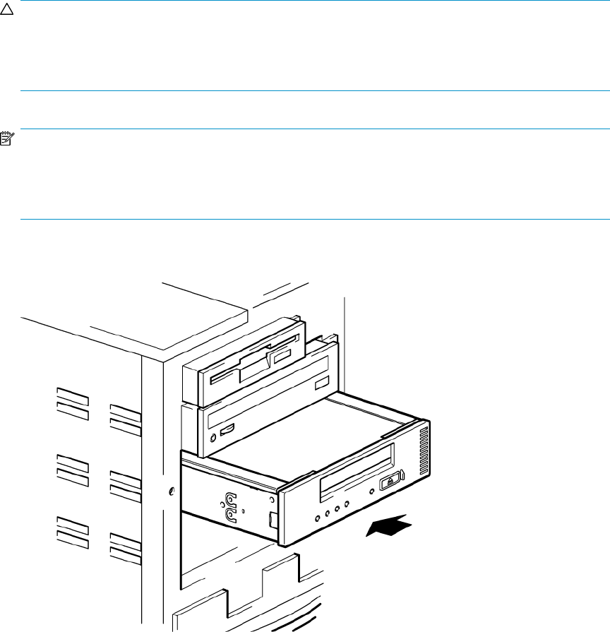 Slide the tape drive into the open bay, aligning the tray or rails with the slots in the bay, as shown