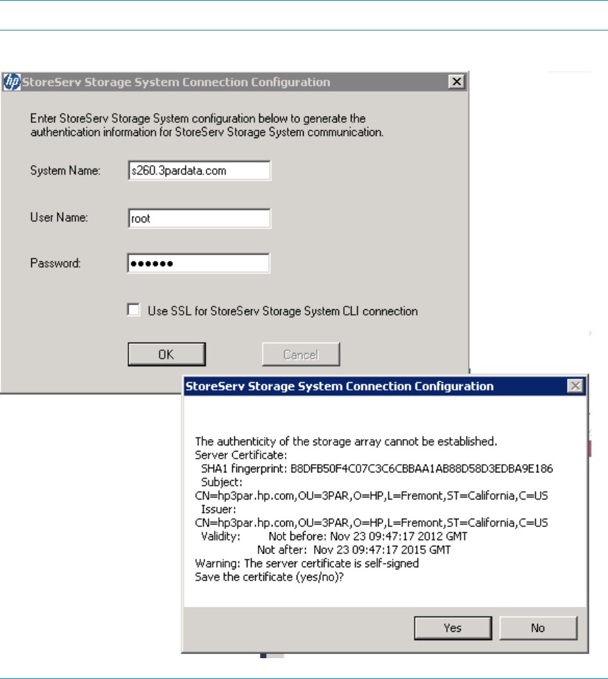 HP 3PAR VSS installer displays a message providing details about the server certificate. Either