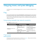 Using ping, tracert, and system debugging Use the ping, tracert, and system debugging utilities to test network connectivity and identify network problems. Ping The ping utility sends ICMP echo requests (ECHO-REQUEST) to the destination device. Upon receiving the requests, the destination device responds with ICMP echo replies (ECHO-REPLY) to the source device.