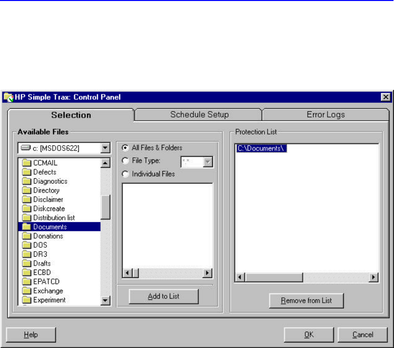 The HP Simple Trax Control Panel Selection tab is divided into two