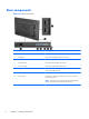 Rear components Figure 2-2 Rear components Component Description 1 AC power connector Connects the AC power cable to the monitor. 2 DisplayPort Connects the DisplayPort cable to the monitor. 3 VGA connector Connects the VGA cable to the monitor. 4 DVI-D connector Connects the DVI-D cable to the monitor. 5 Audio connector Connects the audio cable to the monitor. 6 USB upstream connector Connects the USB hub cable to the monitor's USB hub connector and to a host USB port/hub.